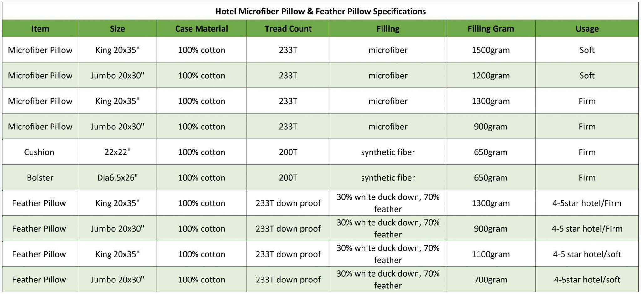Vỏ gối 100% cotton 233T, ruột gối bằng sợi tổng hợp, trọng lượng 1200 gram, mềm mại.